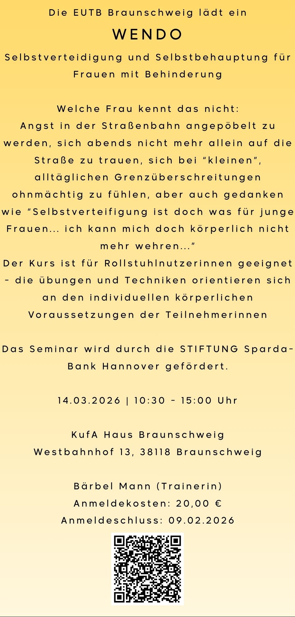 Am morgigen Samstag, den 22.03.2025, findet ein, von der EUTB Braunschweig ins Leben gerufener, Wendo-Kurs für Frauen mit Behinderung in Braunschweig statt.
